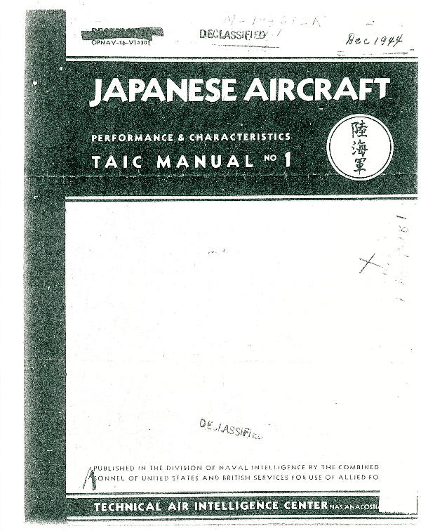 "Japanese Aircraft Performance & Characteristics". Published by Technical Air Intelligence Center NAS Anacostia, Washington DC. "Published in the Division of Naval Intelligence by the Combined Personnel of United States and British Services for Use of Allied Forces". Dated Dec 1944