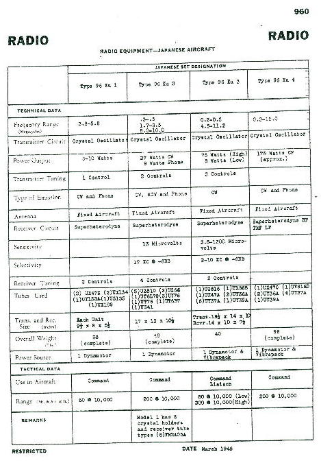 From Page 960. Technical Specifications for Type 96 Radio Receiver/Transmitter Sets. Type 96 Ku 1 is shown in far left column. Page is dated March 1945.